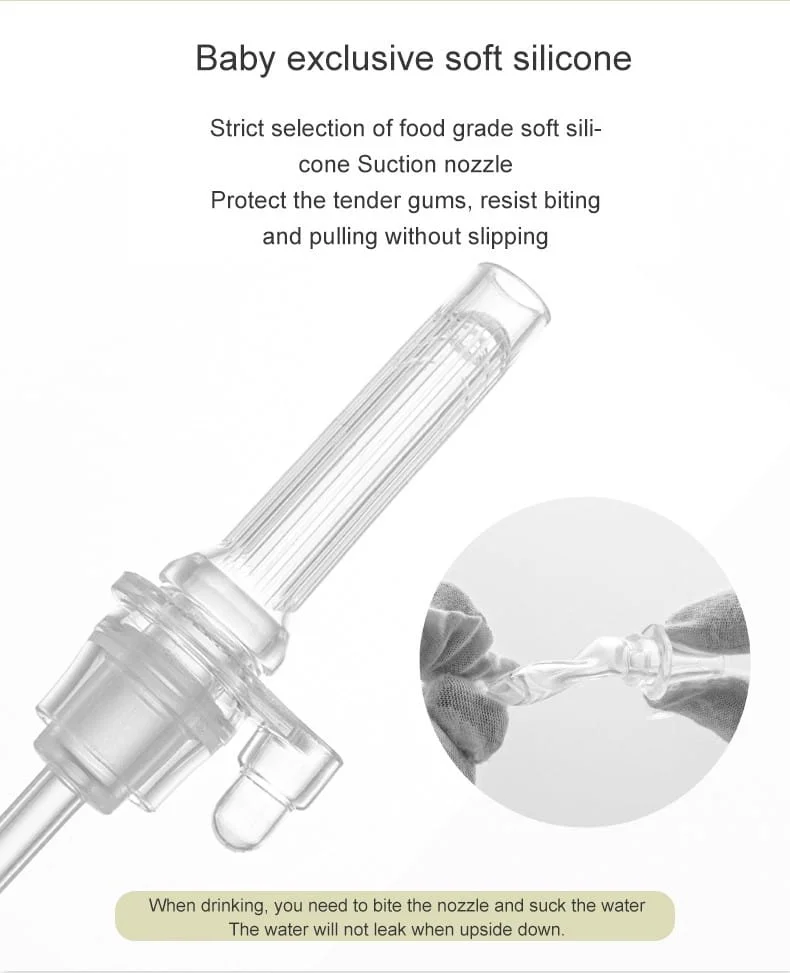 3. قشة زجاجة الطفل مصنوعة من مادة السيليكون الملائمة للطعام، وتصميم الفم الفريد على شكل "X" يمكنه منع تسرب المياه، لذلك لا داعي للقلق بشأن نشاط الطفل أثناء المشي مع الكوب.