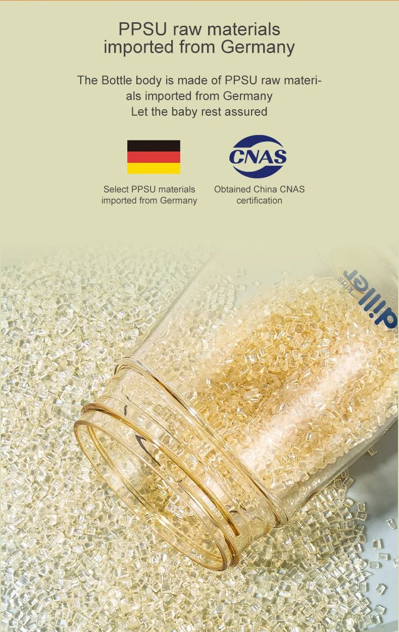 1. زجاجة الأطفال Diller هذه مصنوعة من مادة PPSU، وهي متينة ومقاومة لدرجات الحرارة العالية وخفيفة الوزن ومقاومة للسقوط وسهلة التنظيف وغير سامة وخالية من مادة BPA 100%، وهي مادة آمنة للغاية.