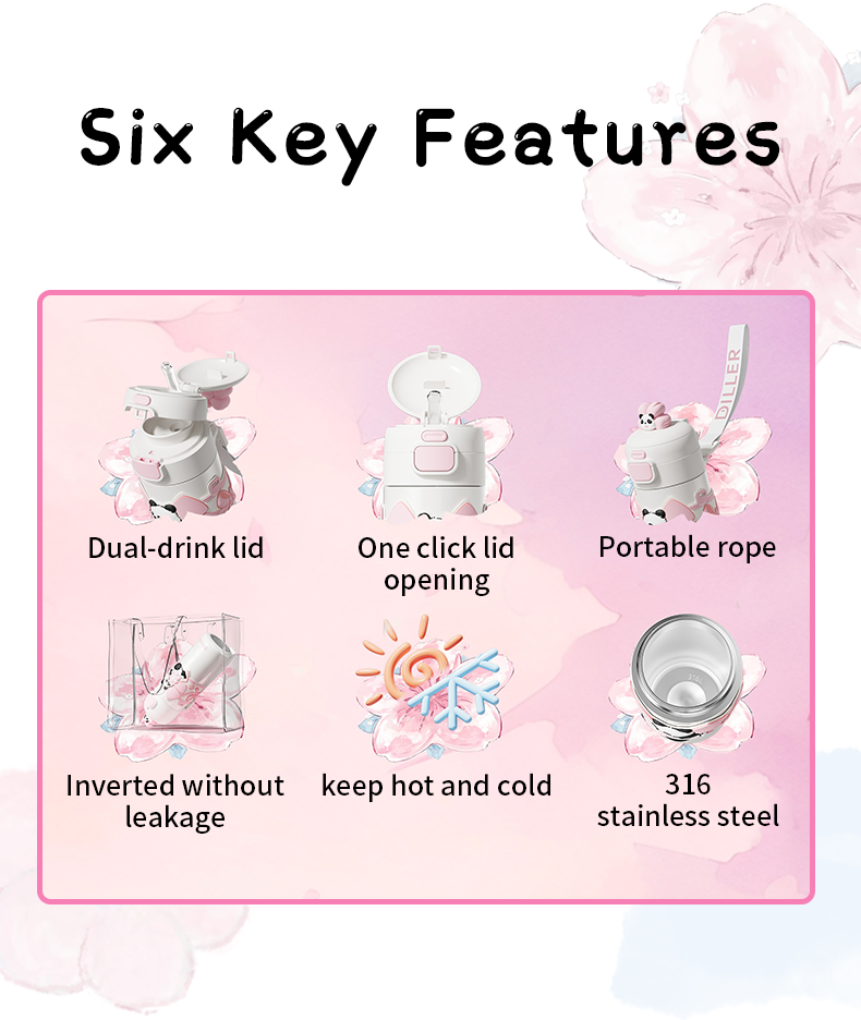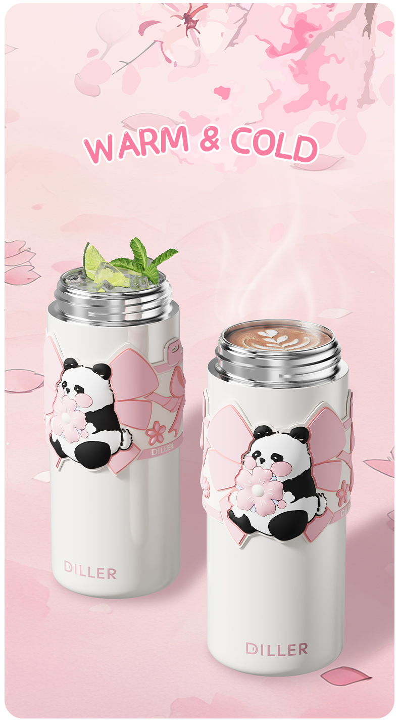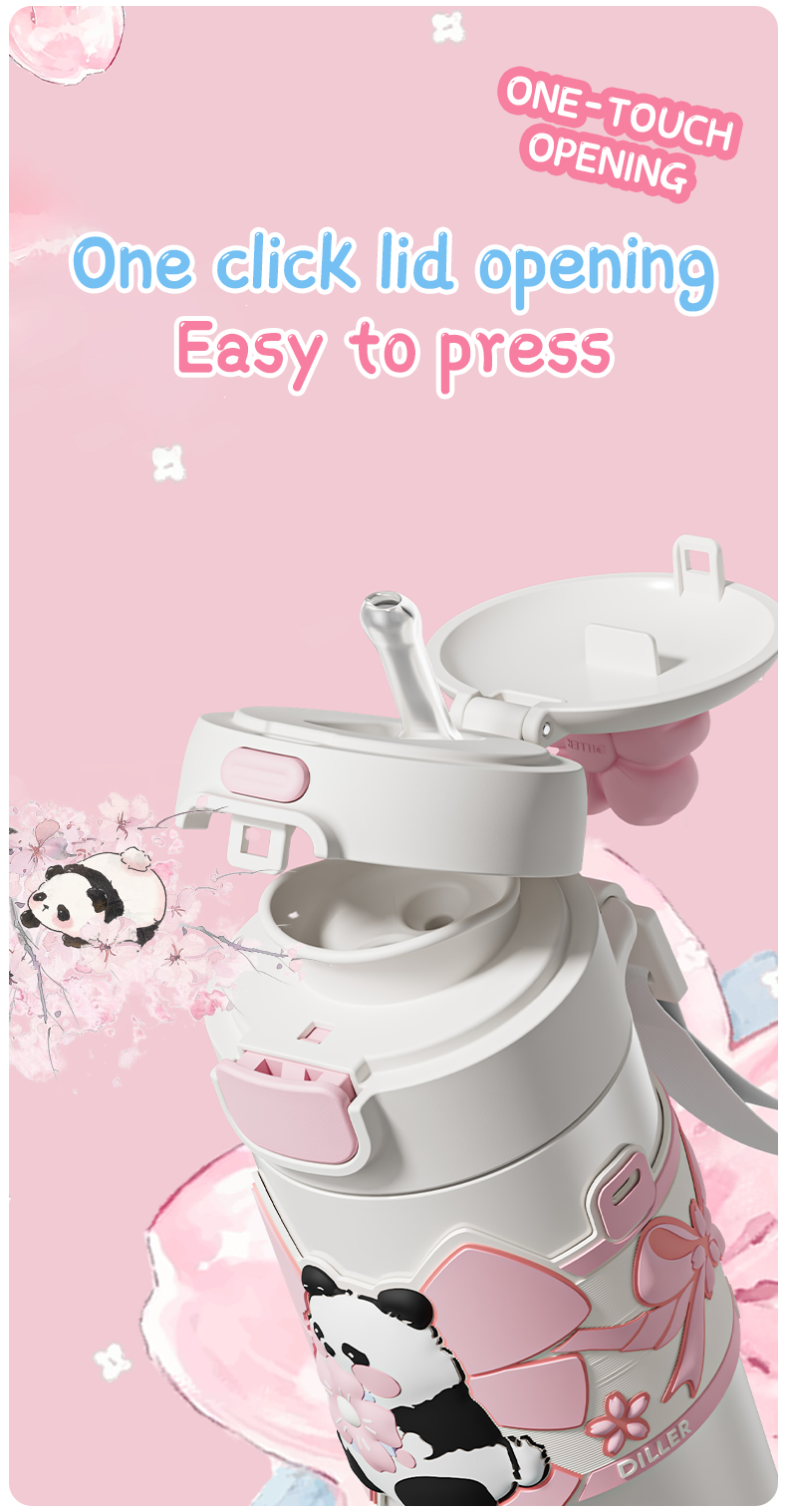 The double-wall vacuum insulation structure effectively maintains beverage temperature for both hot and cold drinks. The dual-drink lid design supports two drinking methods, while the one-click lid opening mechanism improves user convenience.