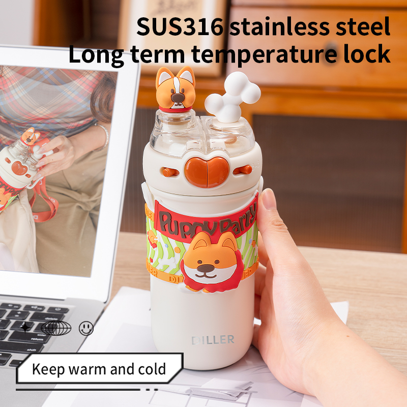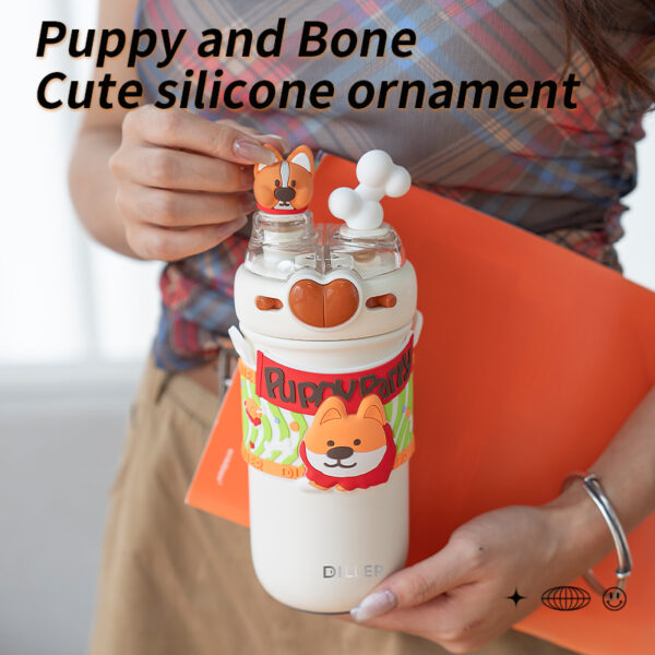 二重のドリンク蓋のデザインで、直接飲むことも、ストローで飲むこともできます。カップの蓋の上にはかわいい子犬と骨の飾りが付いています。