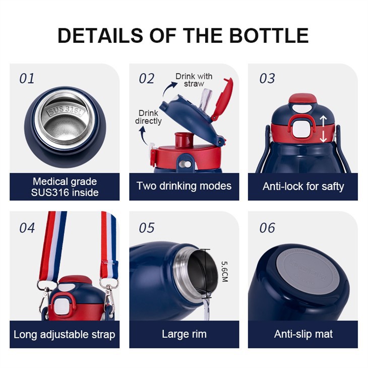 2. 학교 또는 스포츠, 캠핑, 자전거 타기 등과 같은 야외 활동에 적합한 이 어린이용 스테인리스 스틸 물병은 손잡이 또는 어깨 끈이 장착되어 있어 휴대하기가 매우 편리합니다.