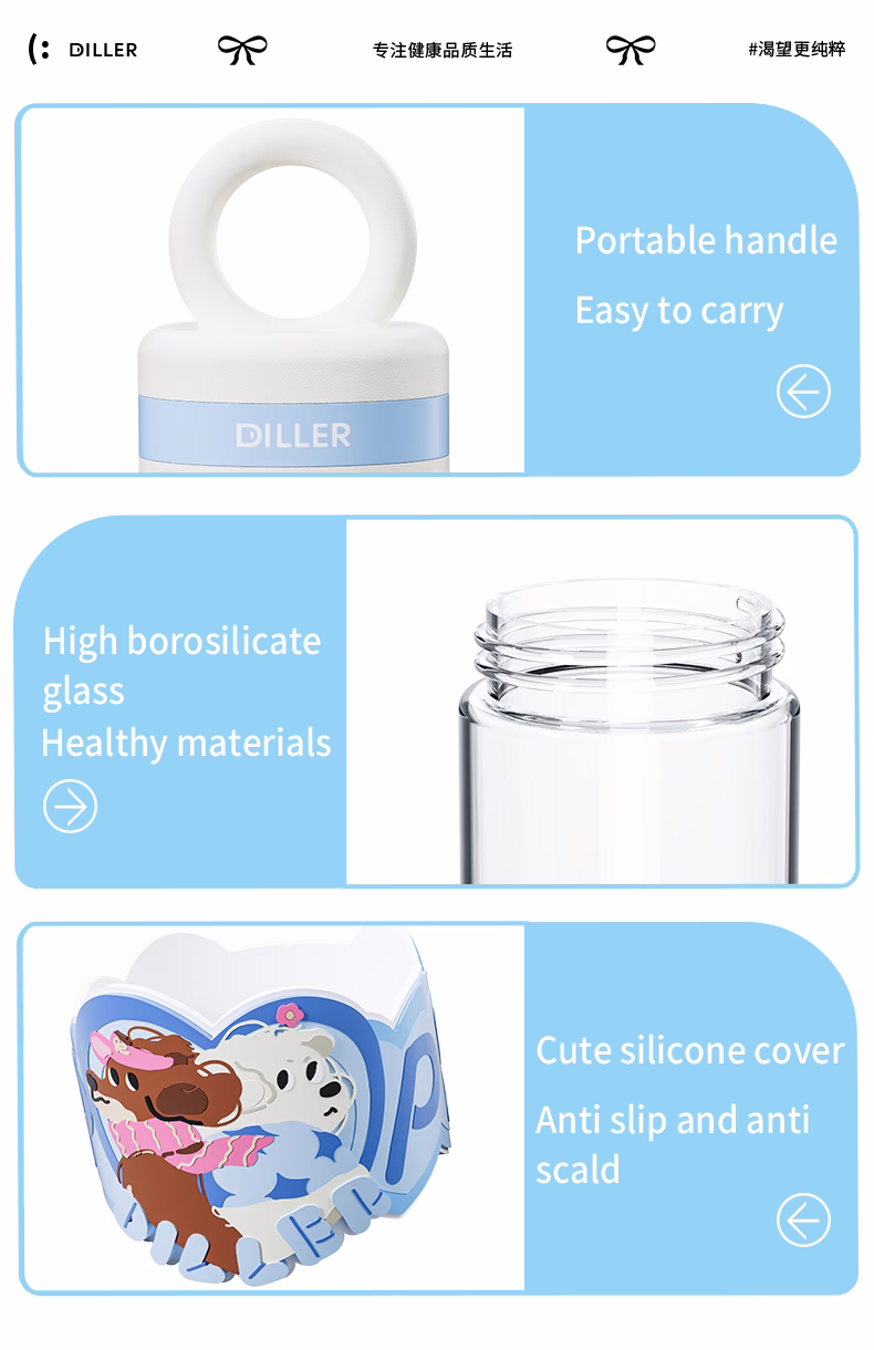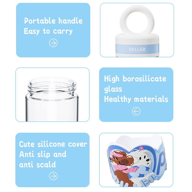 1. 물병은 붕규산 유리로 만들어졌으며 끓는 물(100℃) 또는 차가운 음료(-20℃)에 사용할 수 있습니다.