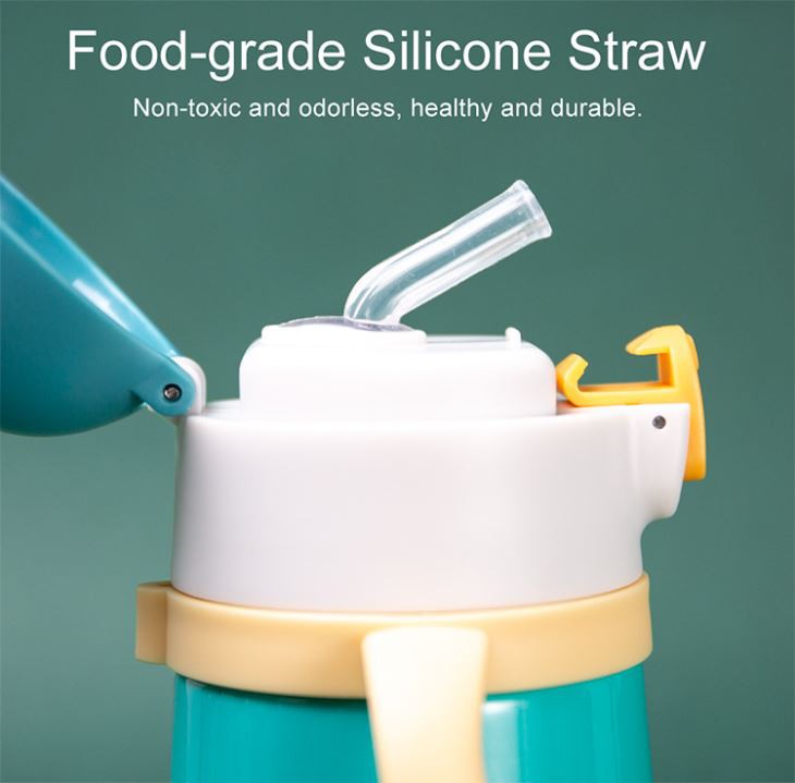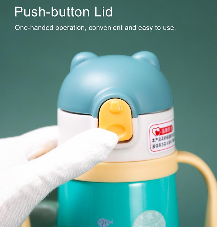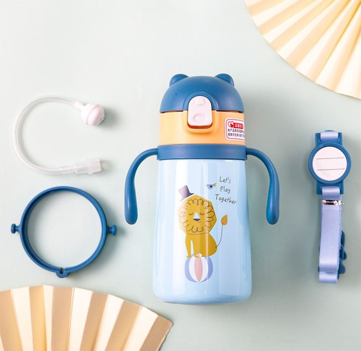 2. 손잡이와 스트랩이 장착된 어린이용 보온병. 손잡이는 아이들이 사용하기 쉽고 스트랩은 여행 시 휴대하기 편리합니다.