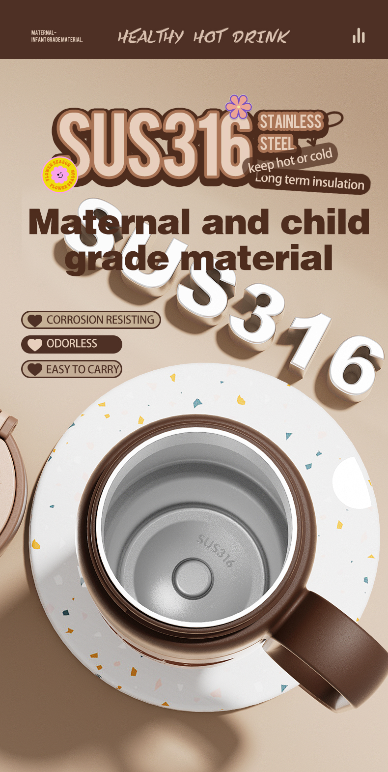 1. Термокружка для кофе изготовлена из нержавеющей стали марки 316, легкой и устойчивой к коррозии.