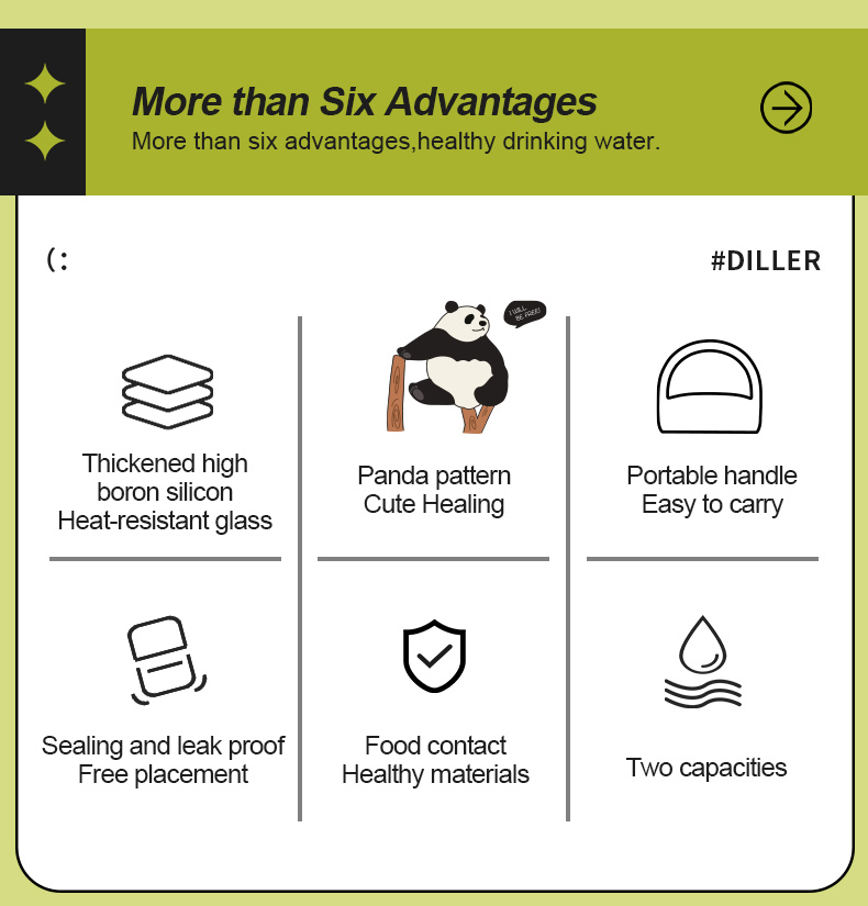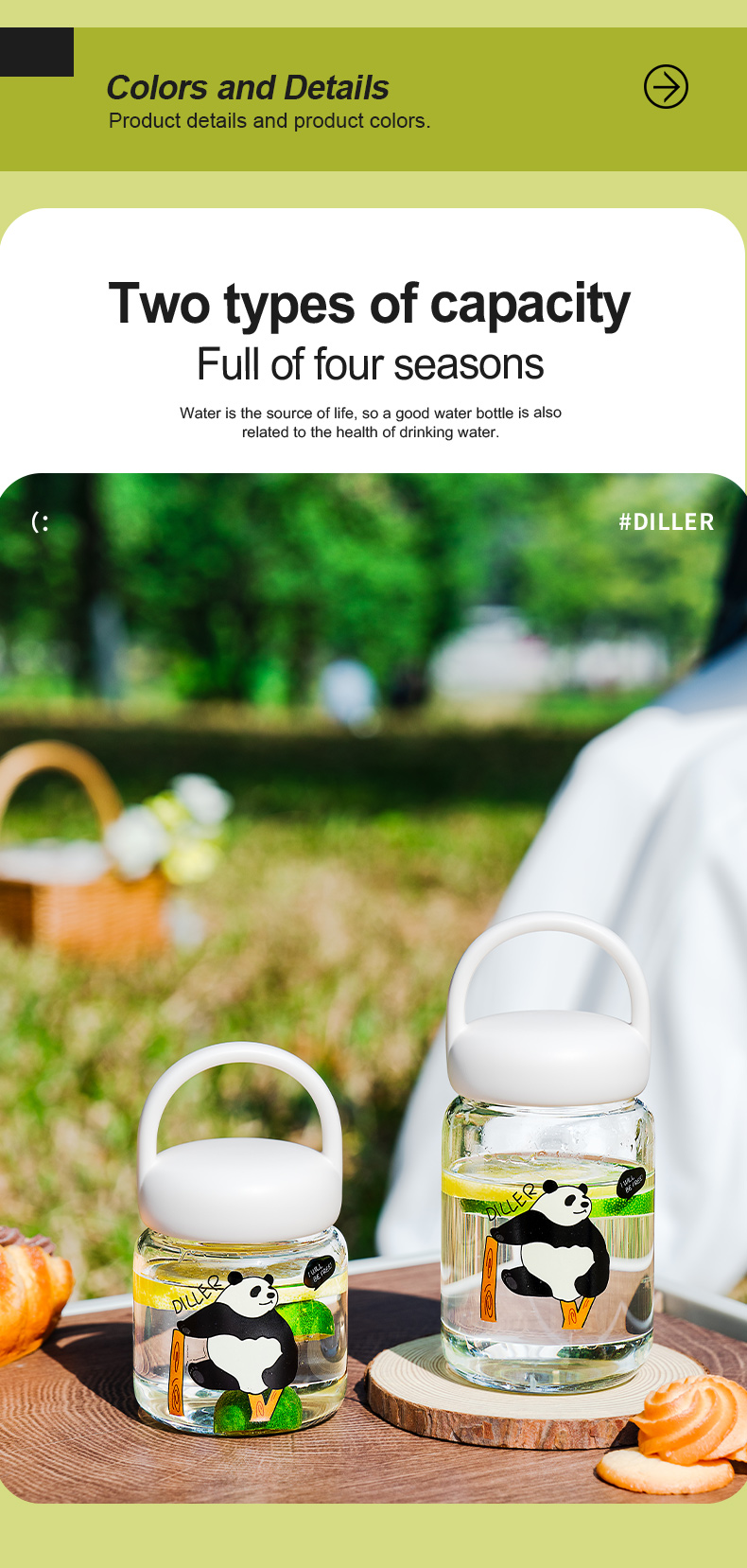 Bu DILLER Panda Cam Şişe sevimli bir panda tasarımına sahiptir ve hidrasyonu hem sağlıklı hem de eğlenceli hale getirir. Yüksek borosilikat camdan üretilmiştir, çevre dostudur, koku yapmaz ve hem sıcak hem de soğuk içecekler için güvenlidir.